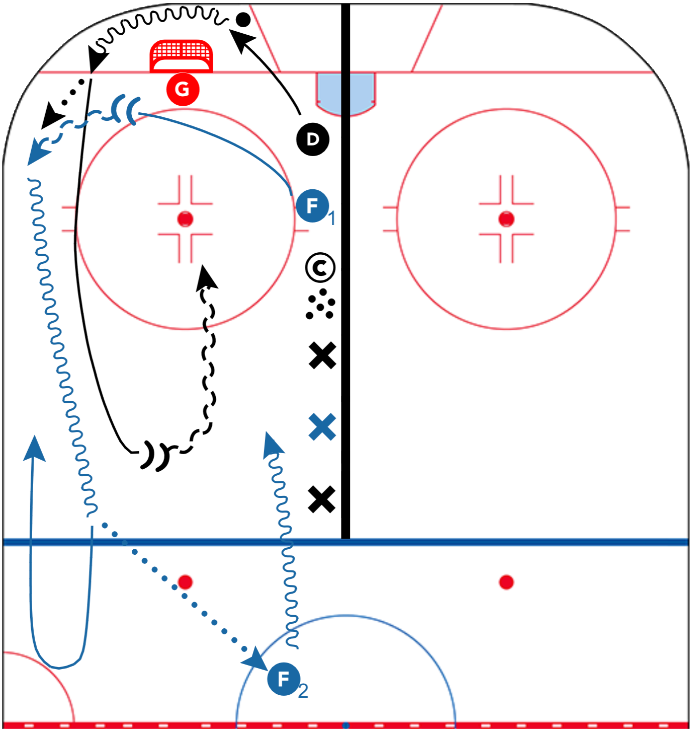 • Coach dumps a puck below the goal line. D retrieves the puck and carries around the net.